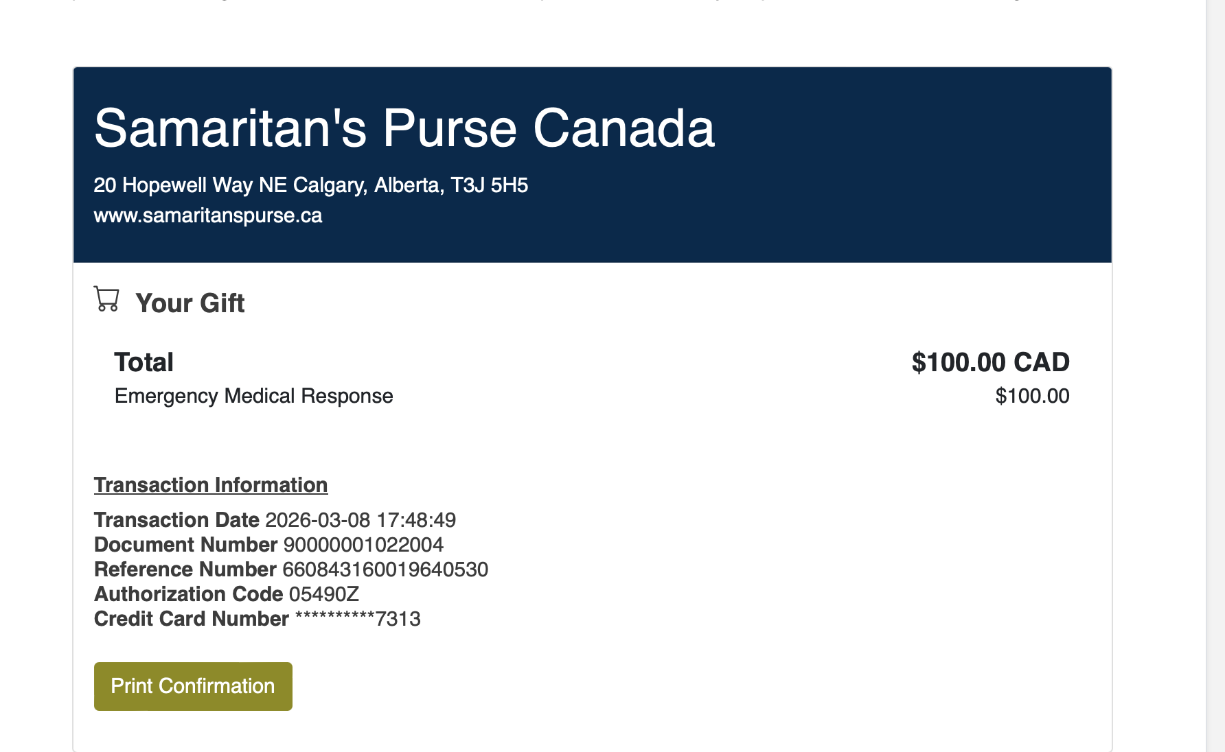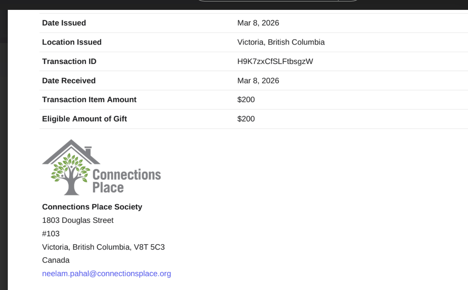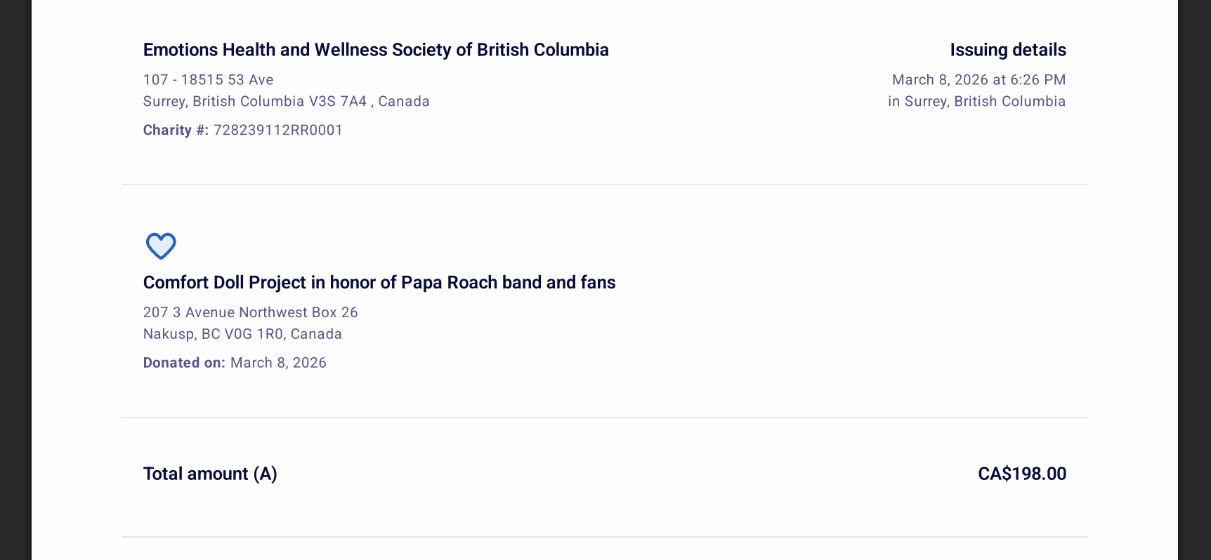 Receipts for Samaritans Purse, Compassion International, Union Gospel Mission, EmotionBC, Connections Place Society, and Family Smart