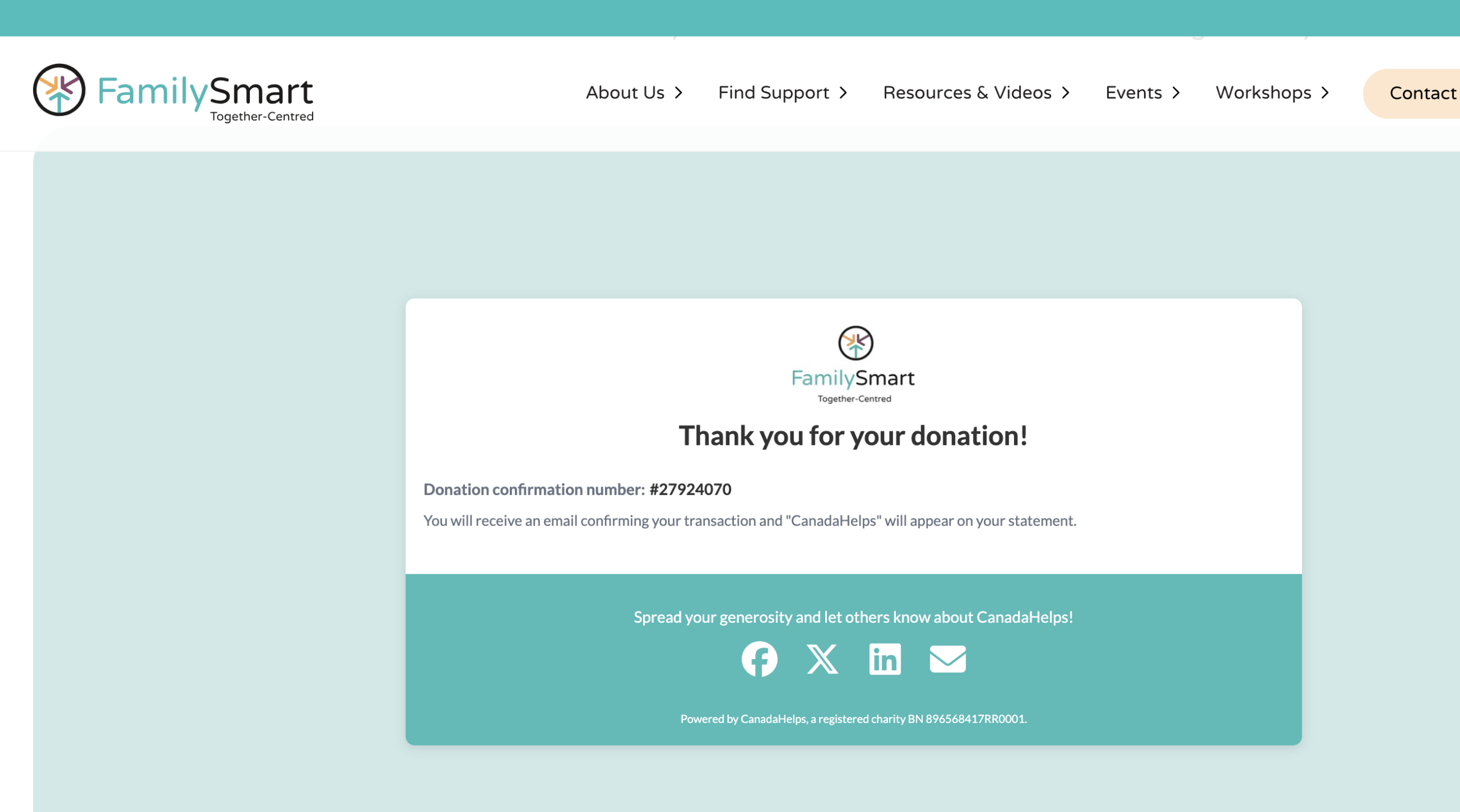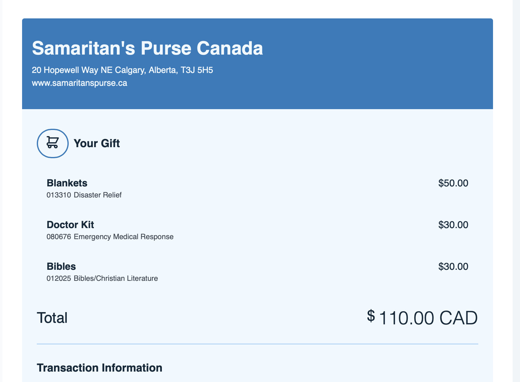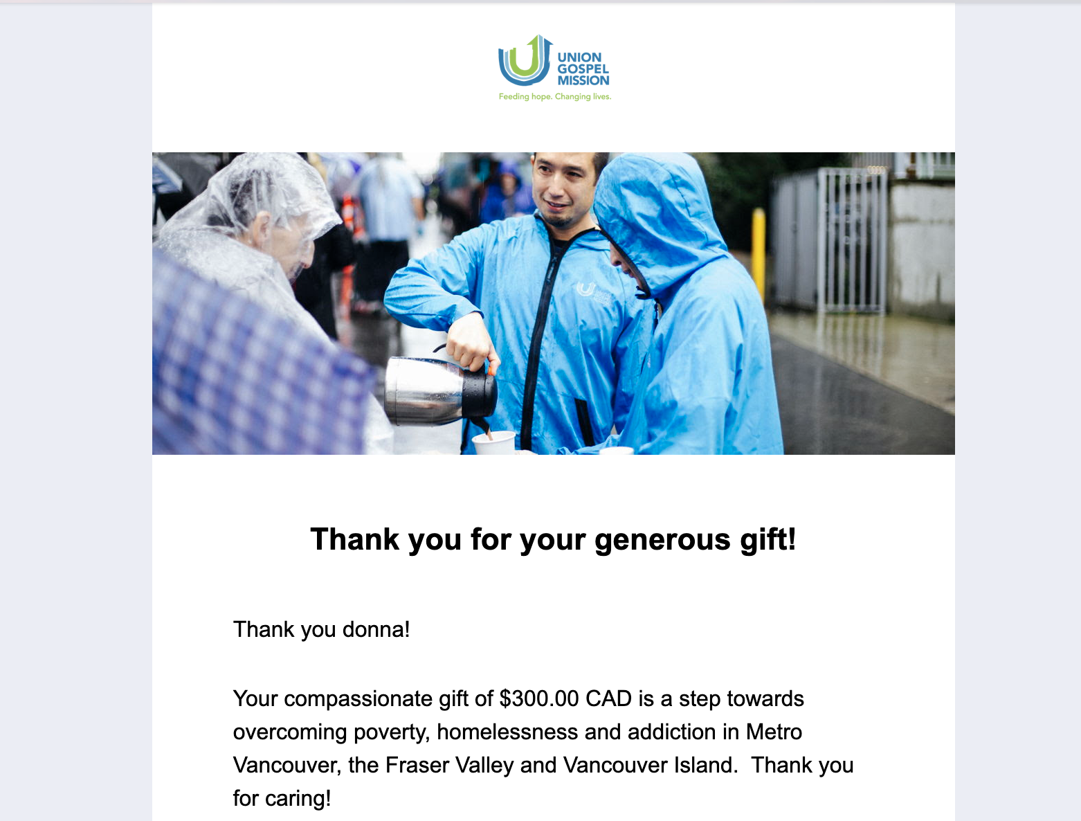 Receipts for Samaritans Purse, Compassion International, Union Gospel Mission, EmotionBC, Connections Place Society, and Family Smart